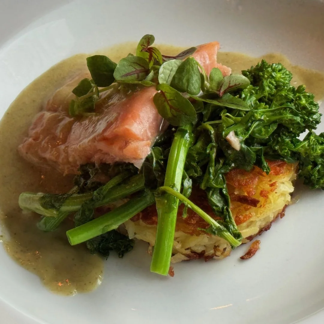 POTATO RÖSTI, SEASONAL GREENS & CAPER CREAM SAUCE (GF)